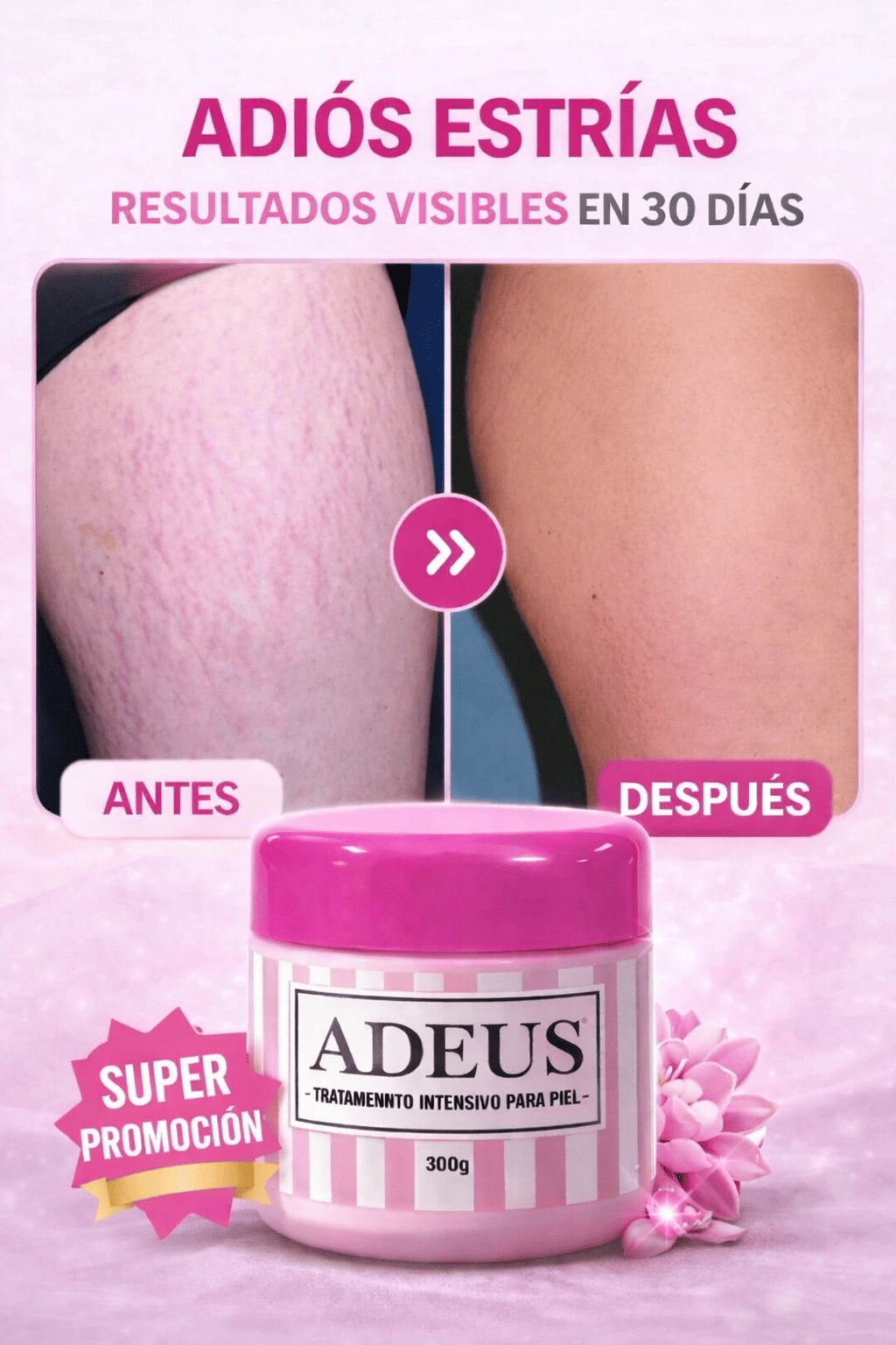 Adeus es la crema corporal que combina ingredientes activos naturales para combatir celulitis, estrías y textura irregular. Con resultados visibles y reales desde las primeras semanas.