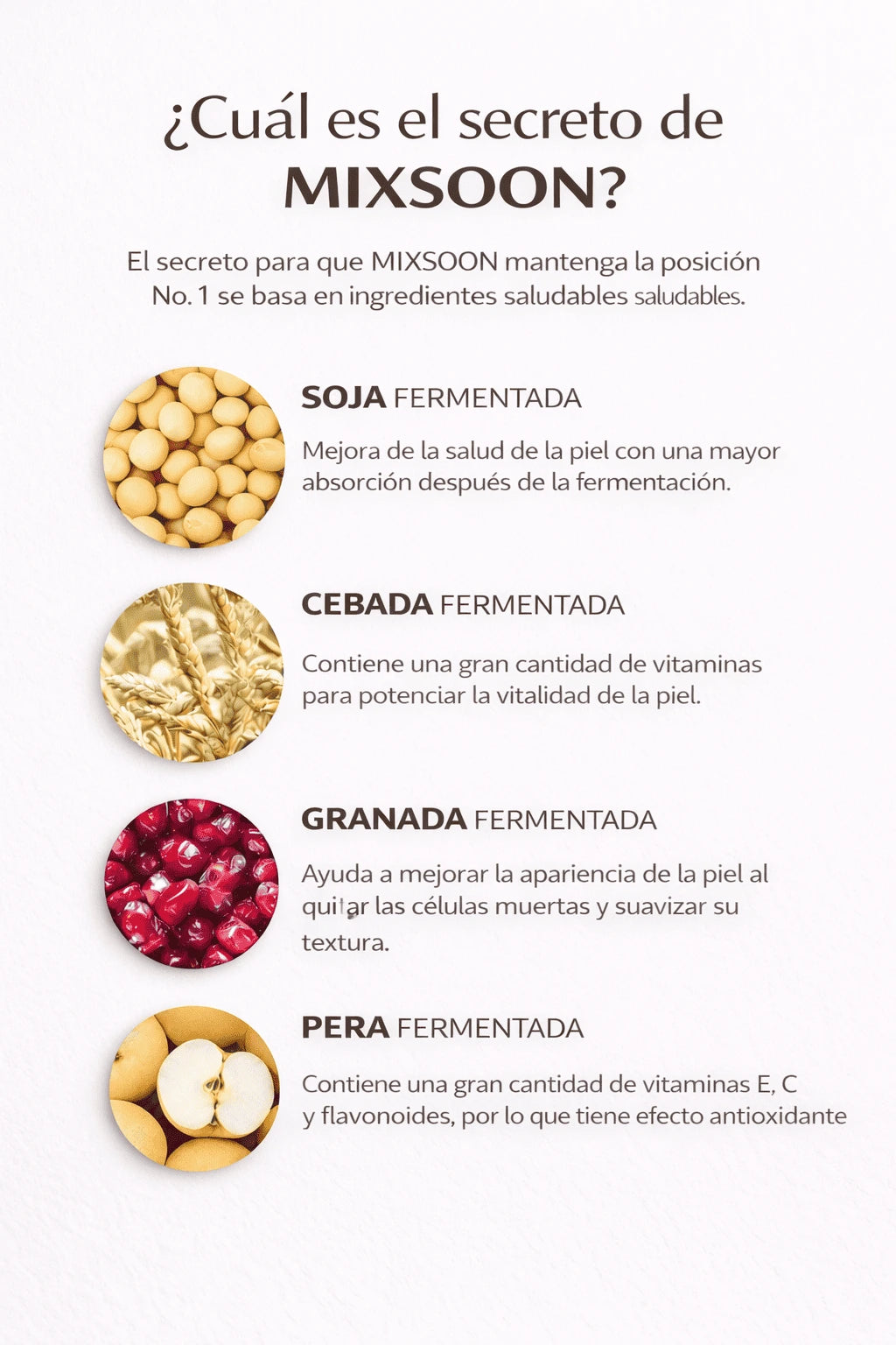 Mixsoon Bean Essence está formulada con ingredientes fermentados de origen natural como soja, cebada, granada y pera. Cada uno ha sido seleccionado por su poder para hidratar, suavizar y revitalizar la piel sin irritarla. Gracias al proceso de fermentación, estos activos se absorben mejor y actúan más rápido